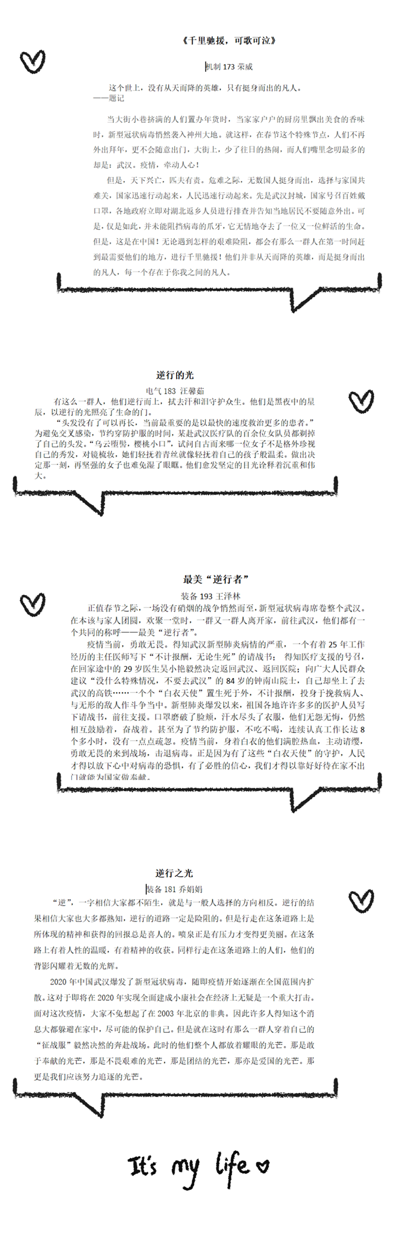 本次征文主题为“众志诚诚,共同战疫”。比赛共持续了20天,同学们不断修改文章,创造了不少优秀的文章。经过评委们的评审,活动诞生了一等奖一名,二等奖三名,三等奖五名。