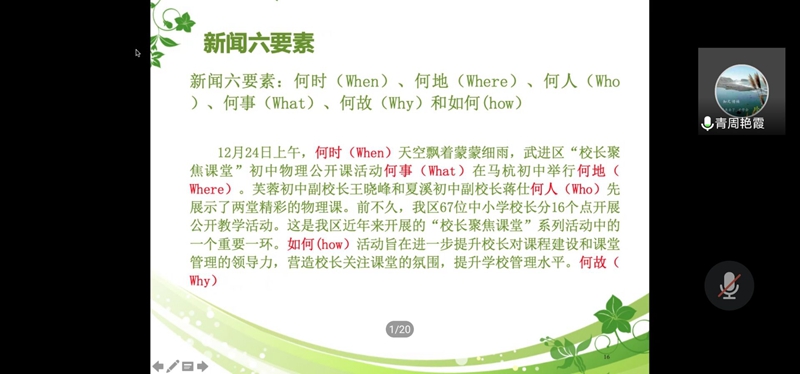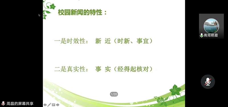 该活动总体旨在教育同学们用自己的坚定的内心去写好一篇新闻稿,以注重实事和大众感受为主,记录发生的新闻实事。活动中,周校长以视频和ppt等形式,从自身心得体会出发,深入讲述了编写新闻的事实性,目的性和准确性,明确了新闻撰写人所需要负起的责任与担当。