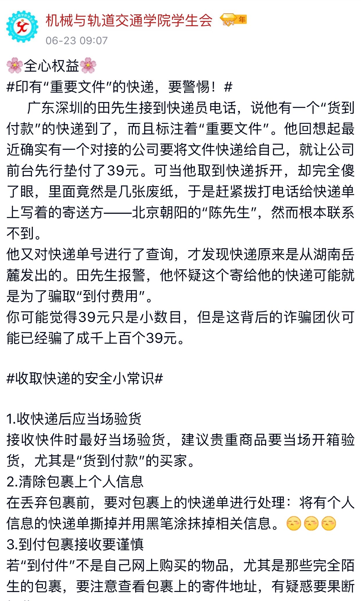 此次开通并运行的“全心权益”专栏从全院同学的基本权益出发,解决了同学们生活上的最根本的问题,使机械与轨道交通学院学生会心理权益部的职能更加完善。