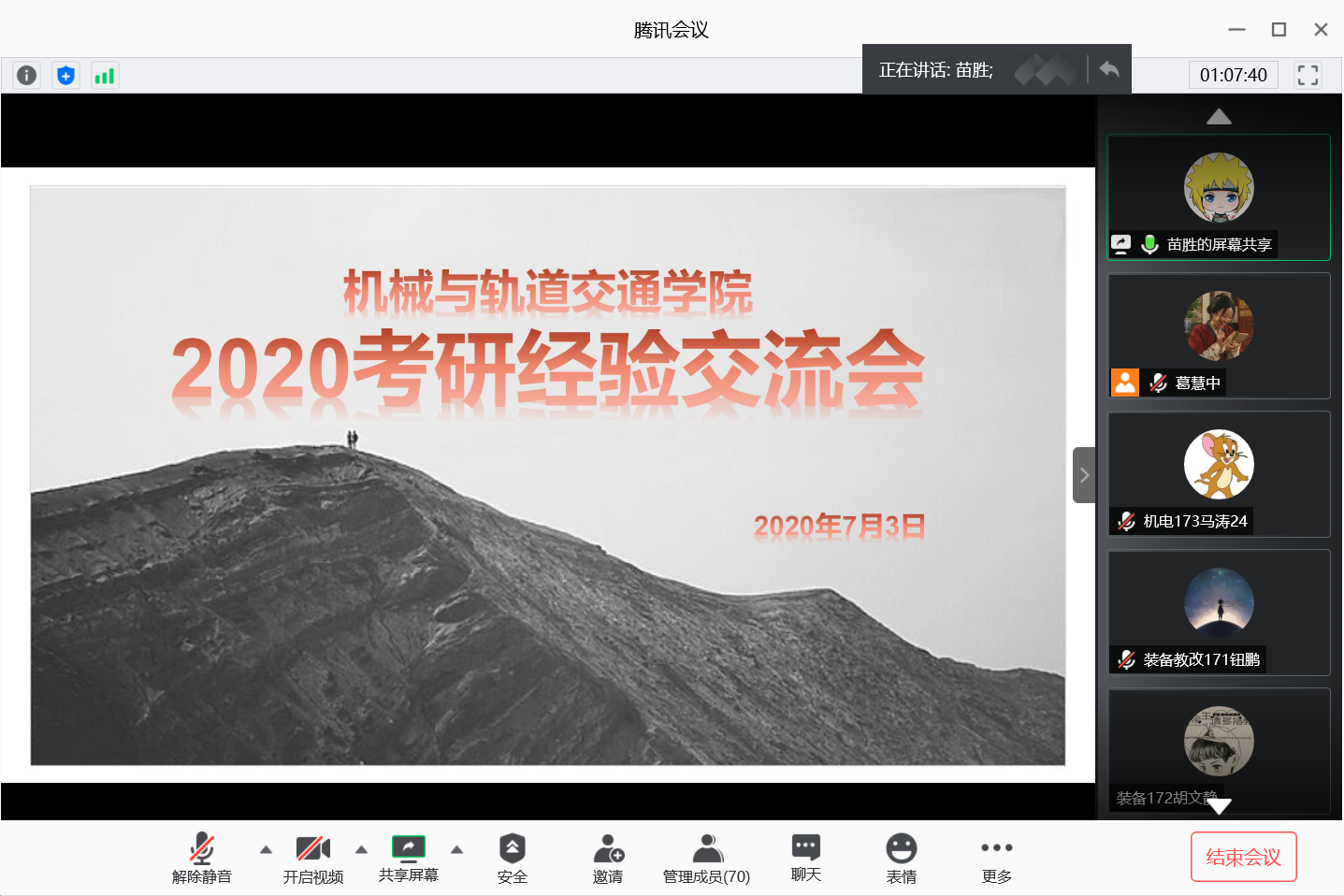 时光飞逝,再见已是离别。为了更好地传承机械与轨道交通学院的优良传统、营造良好的学习氛围,我院在2020年7月3日晚,利用腾讯会议线上开展了2020考研经验交流会。会议包括考研经验分享和提问互动两个环节,7位优秀考研学身代表、学工办相关老师及学院2017级学生参与此次会议,会议由葛之琳主持。