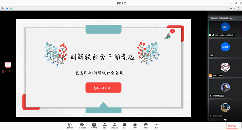 本次大会采用线上线下相结合的形式开展。大会第一部分,由目前各个社团的负责人进行述职。各个社团轮流针对社团本学期工作进行了总结与反思,汇报工作的同时也都找出了社团本身的缺点,并在老师的指导下给出了改进方案。第二部分为社团换届仪式。每个社团由竞选者进行3分钟的自我展示,简单介绍自己并阐述竞选理由。