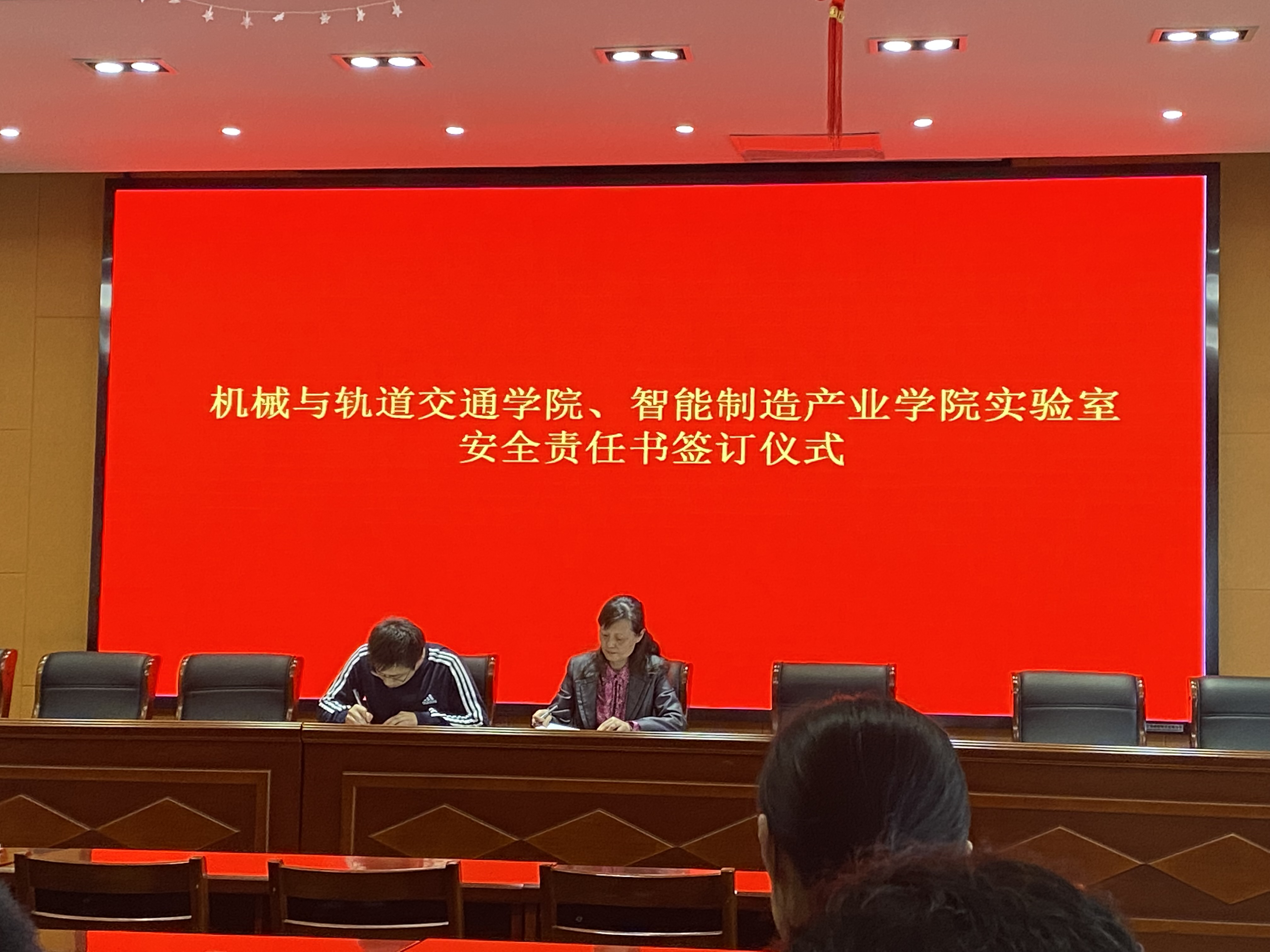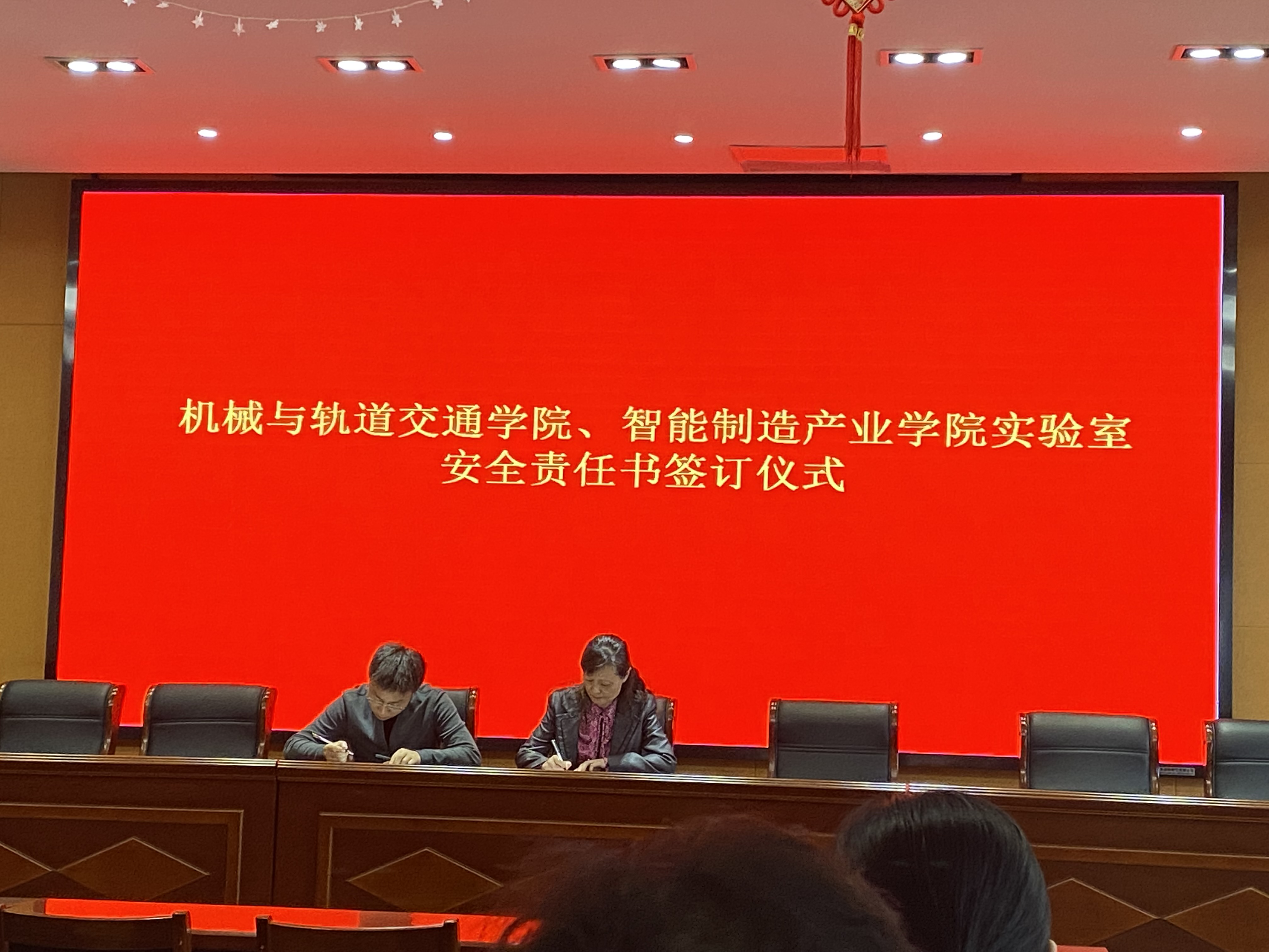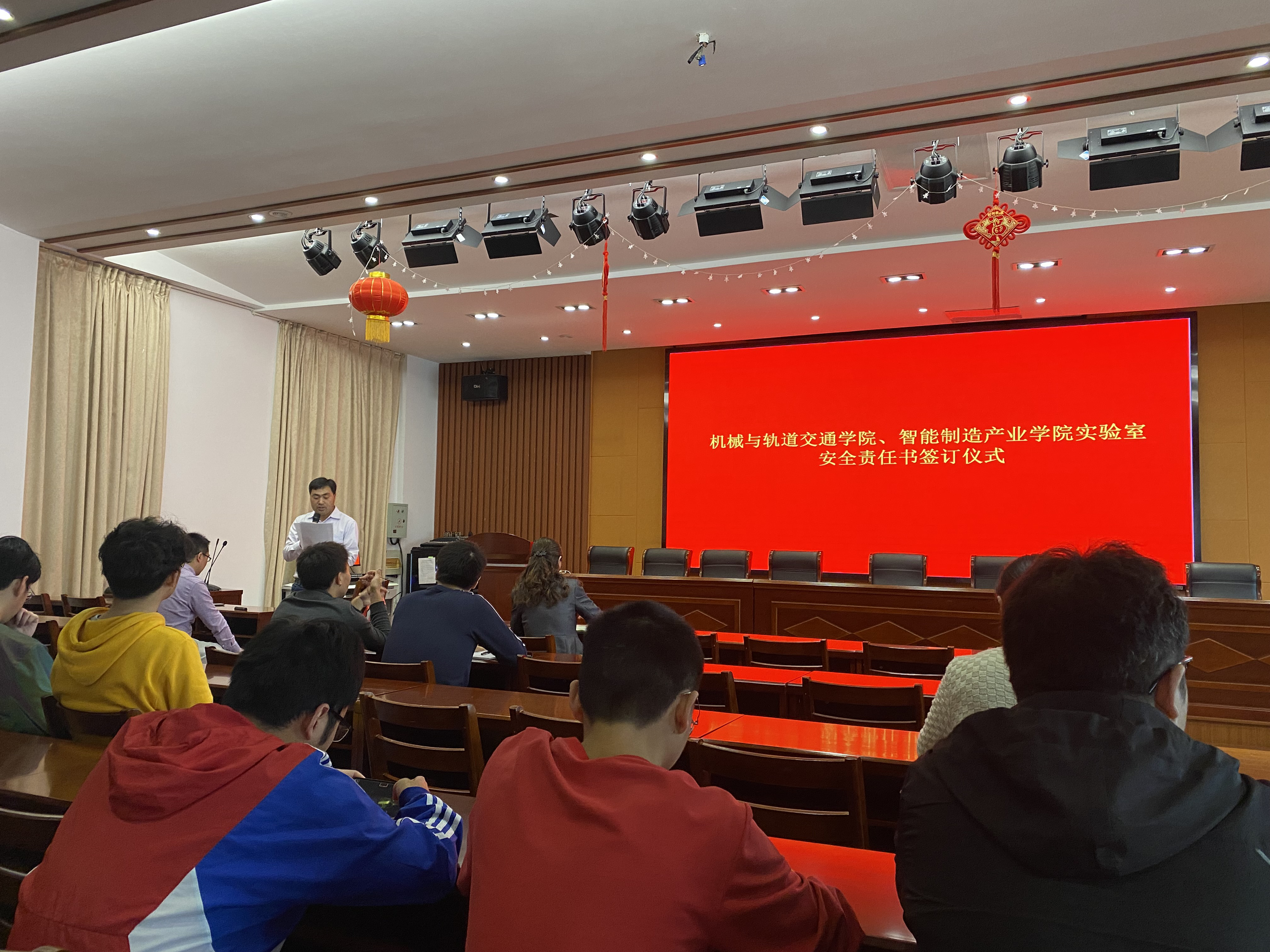 为强化安全意识,杜绝安全隐患,保证实验教学及科研工作的正常进行,压实实验室安全管理责任,强化实验室安全管理意识,学院组织了安全责任书签订活动。2021年5月19日,机械与轨道交通学院、智能制造产业学院在乐行楼二楼报告厅举行实验室教师安全责任书签订仪式。活动由付双成副院长主持,学院党政领导、实验室安全责任人、实验室使用教师和研究生参加了签订仪式。