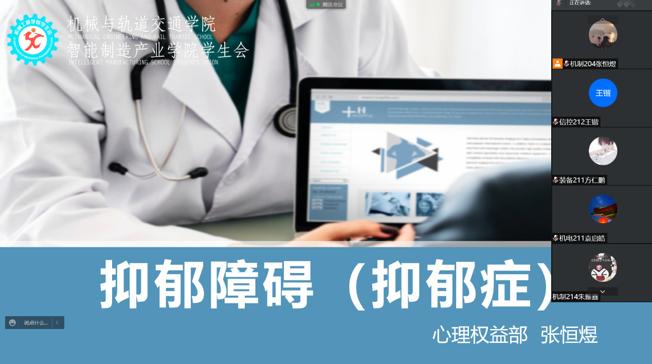 11月14日晚,机械与轨道交通学院,智能制造产业学院学生会心理权益部在线上开展 “防抑郁倾向”知识普及会。学生会心理权益部张恒煜主持了本次会议,参会人员为各班级心理委员以及学生会心理权益部全体成员。