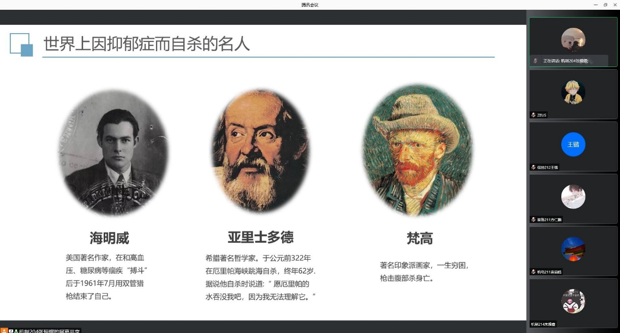 本次会议从抑郁症的概念展开,分别介绍了常见的抑郁症种类、抑郁症的诊断标准、近些年我国抑郁症的发病率、如何预防抑郁倾向、确诊抑郁症后如何去调解治疗等知识,向同学们全方位地普及了抑郁症的基础常识以及如何预防抑郁倾向等心理知识。