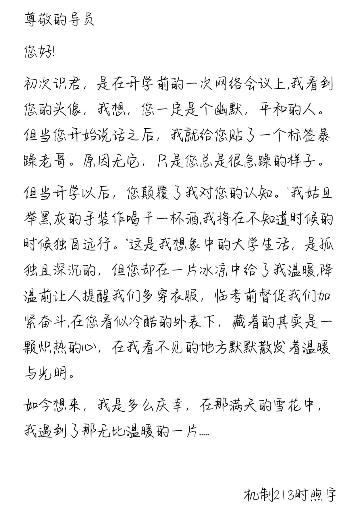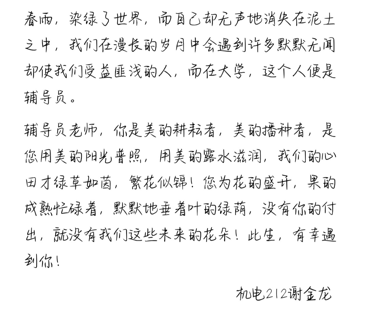活动中,学生们将内心对辅导员的想法以及想对辅导员说的话写成一封封信,由学生会心理权益部成员接受汇总后交到各位辅导员手中。同学们的信件让辅导员们感到非常惊喜,当接到一位位学生用心书写、满怀感激之情的信件时纷纷感叹:“在参与教学工作这么久以来,看到这些孩子们用心书写的文字,心里觉得很温暖也很感动!”。