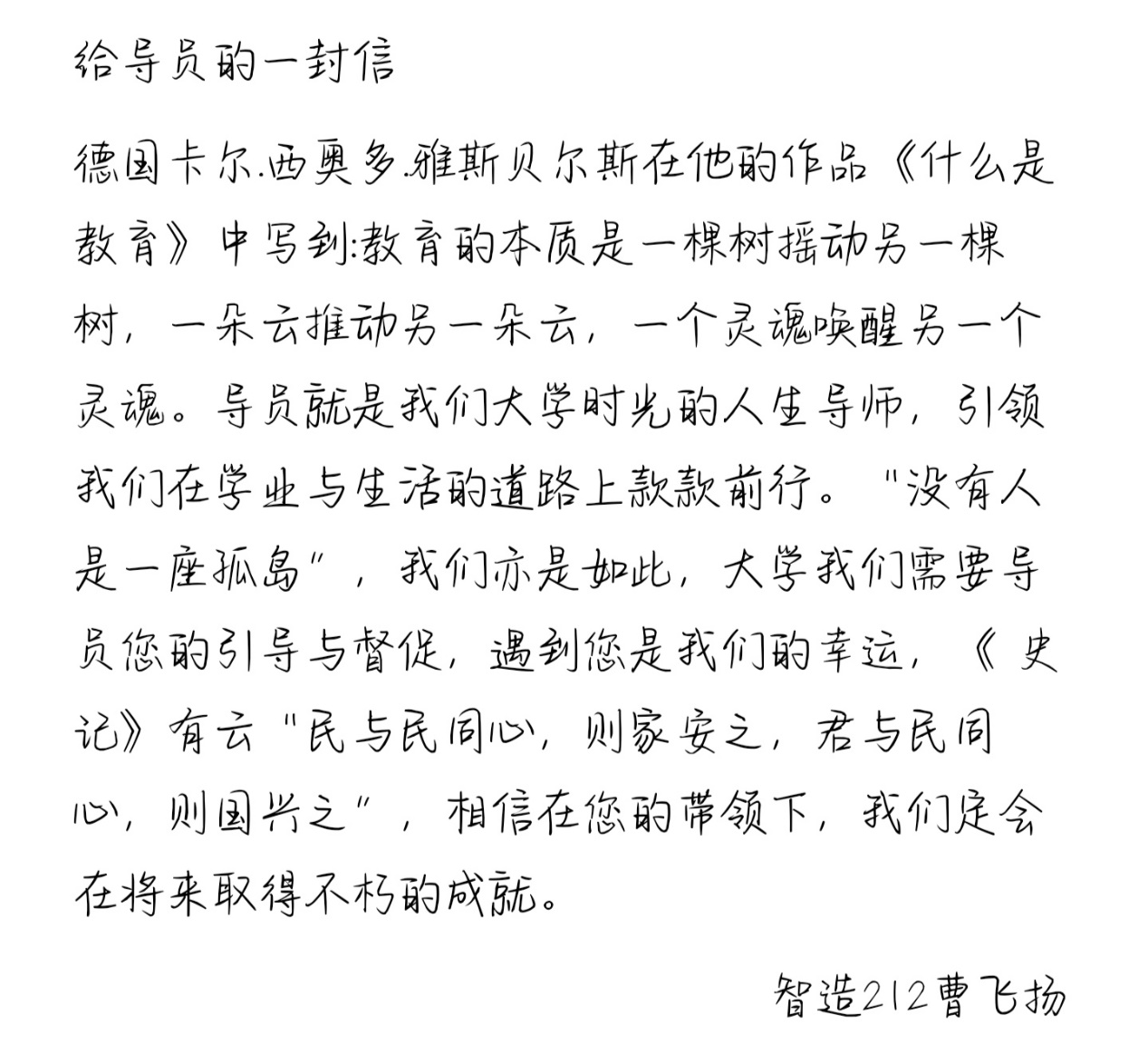 为了促进辅导员与同学之间关系的融洽,让辅导员成为学生可交心的朋友,为学生们成长、成才引领指路,机械与轨道交通学院,智能制造产业学院学生会心理权益部近期成功举办了“给辅导员的一封信”活动,学院学生积极参与了此次活动。