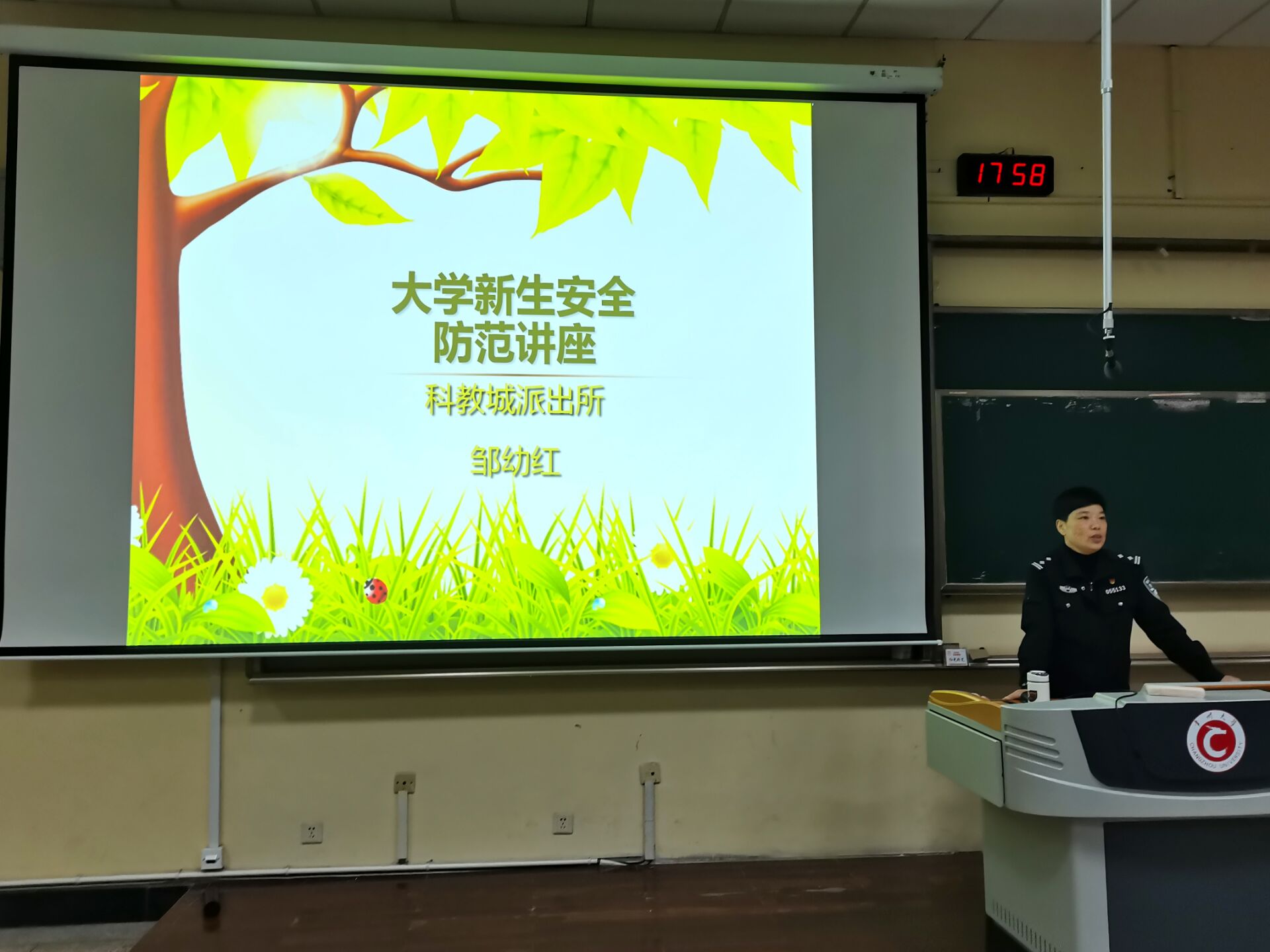 为进一步增强2021级新生的安全意识,提高自我保护能力,创建平安校园。我院11月30日晚6点,在W5阶和W6教室召开新生安全防范讲座。本次讲座由科教城派出所邹幼红警官和何之源警官主讲。