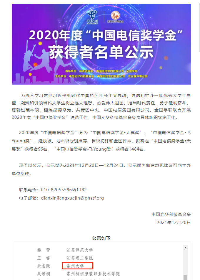 经过多轮考核,我院动专192余志康获得了2020年度“中国电信奖学金”。