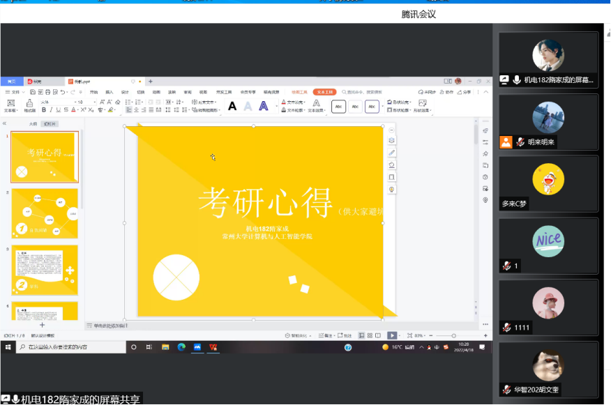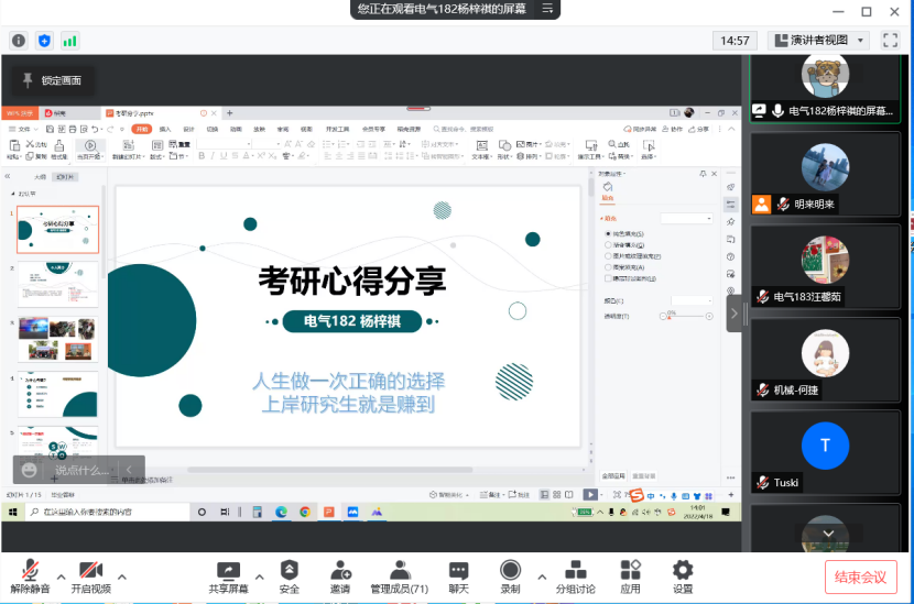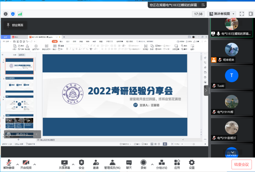 分享会采用线上会议的形式,邀请了2018级机电专业陈佳丽、隋家成,2018级电气专业杨梓祺、汪馨茹四名上岸同学作为分享嘉宾。学院党委副书记葛涛、副院长郑剑锋、机电专业负责人佘志刚、电气负责人荆胜南以及辅导员葛慧中、何捷、张明来参加了分享会。本次分享会受到了同学们的热烈欢迎,共有220余名19级、20级参加了线上分享会。