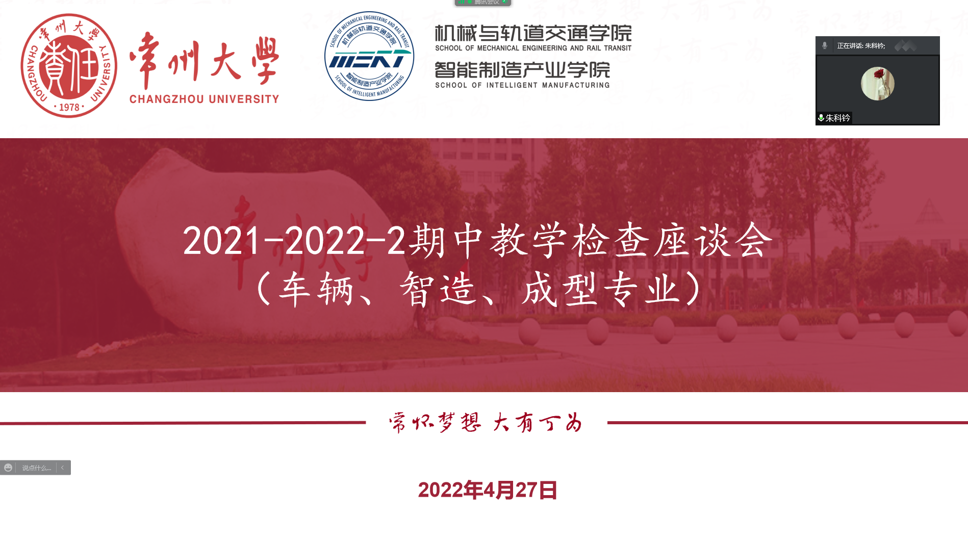 为贯彻学习学校期中教学检查工作相关文件精神,更好地开展教学、管理和服务工作,我院于2022年4月27日和4月29日召开了各专业期中教学检查师生线上座谈会。校督导、院关工委成员魏安安、邹旻,院党委书记谢章丽、院长刘雪东、院党委副书记葛涛、教学副院长朱科钤、相关专业负责人、任课教师、辅导员和学生代表们参加了本次会议。