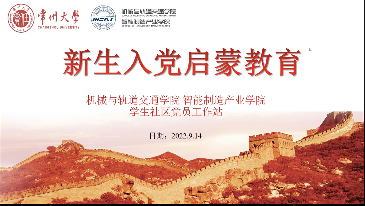 2022年9月14日下午,机械与轨道交通学院 智能制造产业学院研究生会通过腾讯会议向同学们说明本次活动意义与安排,并邀请辅导员张明来老师对新生进行入党思想启蒙教育,分别从中国共产党的指导思想、宗旨、最终理想、基本路线等方面介绍了党的基本知识,向同学们解答了入党是为了什么,入党以后要干什么等相关问题,并强调了学校在发展党员方面的标准、要求、程序等,希望同学们不仅要在思想做好入党准备,更要做好行动准备。