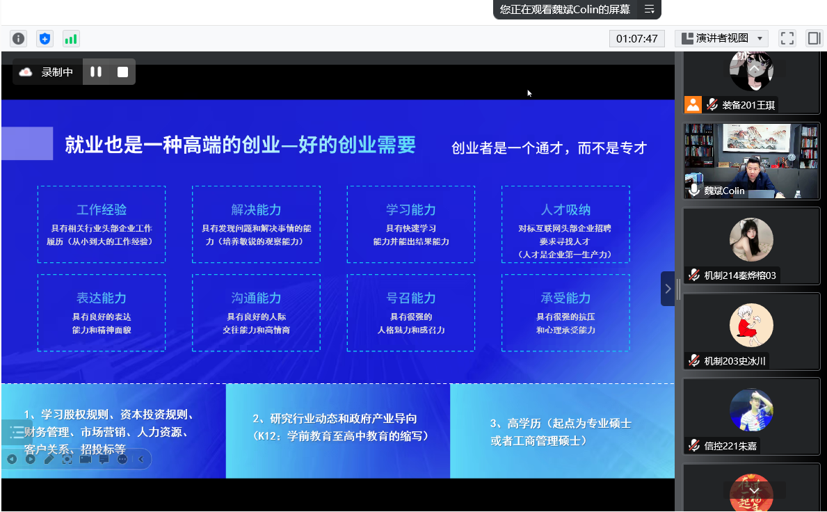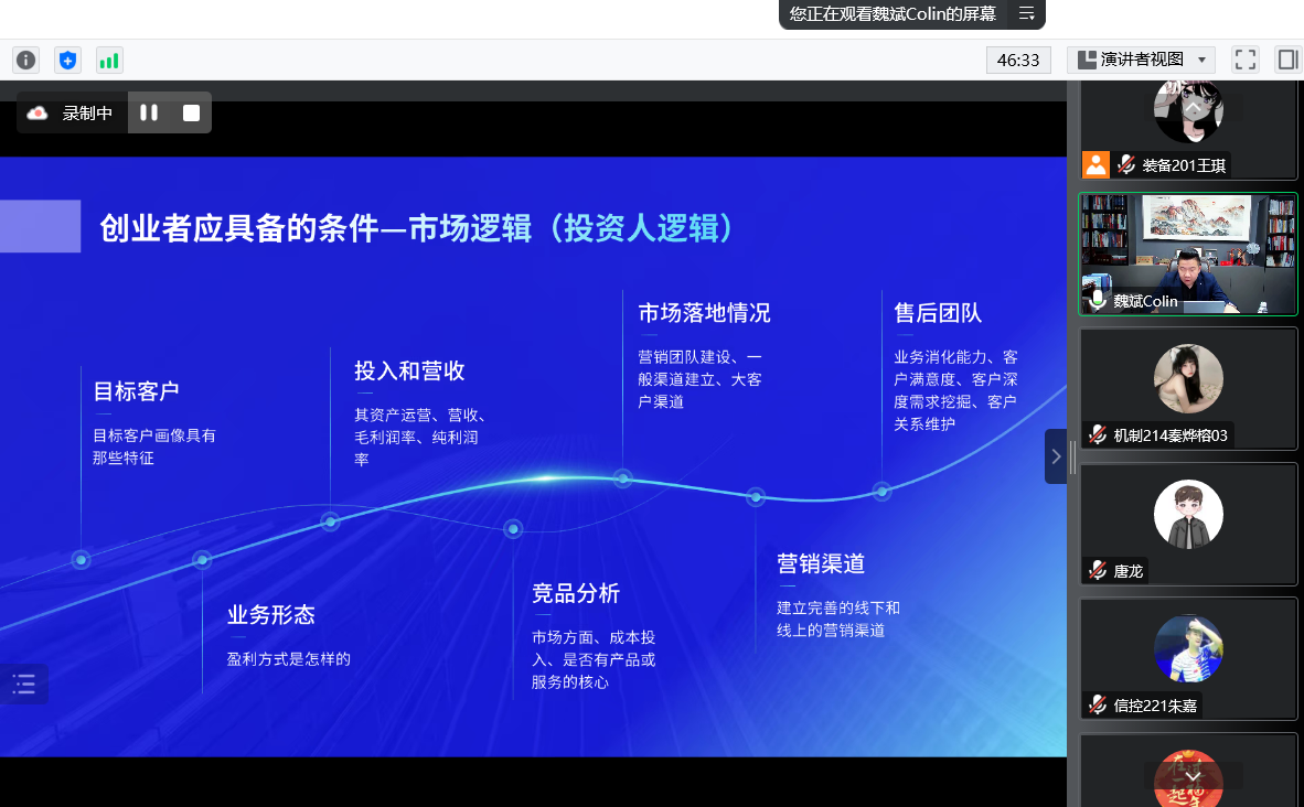2023年3月18日,机械与轨道交通学院 智能制造产业学院团委和青年学习社主办的求索讲堂之“创”享未来主题讲座在线上顺利开展。讲座邀请江苏苏青汇控股集团有限公司总裁、共青团中央全国大学生创业英雄、江苏省教育厅金种子创业导师魏斌主讲。机械学院全体班级参加了本次创新创业主题讲座。