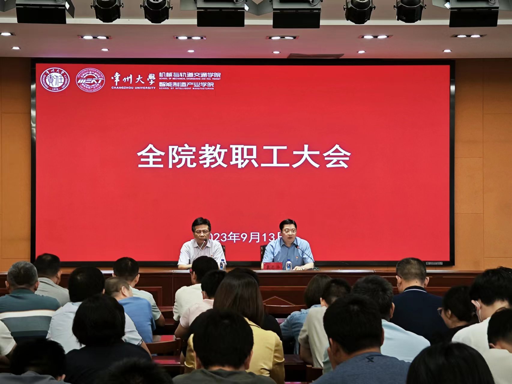 9月13日下午,常州大学机械与轨道交通学院 智能制造产业学院全院教职工大会在乐行楼243报告厅召开。党委书记袁志华、院长刘雪东、党委副书记葛涛以及分管研究生培养的郑剑锋副院长分别部署工作,学院领导班子以及全体教职工参加大会。袁志华主持会议。