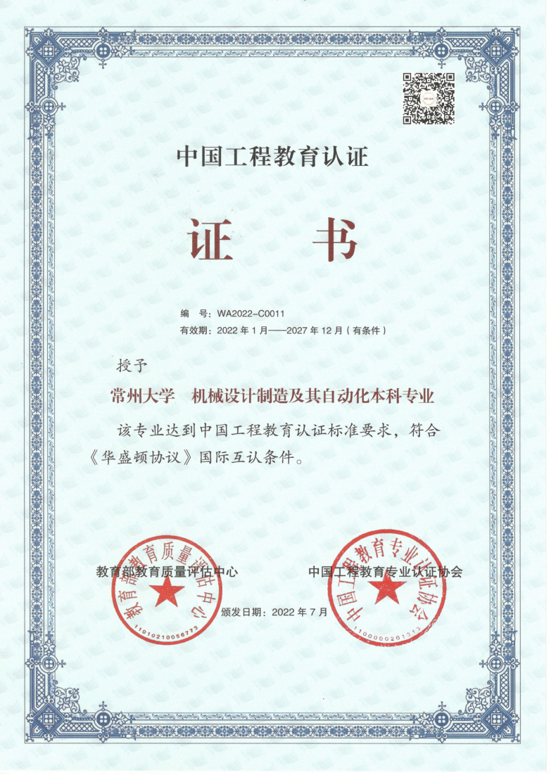 机械设计制造及其自动化专业2020年申请,2021年完成现场考查,2022年发文通过认证。