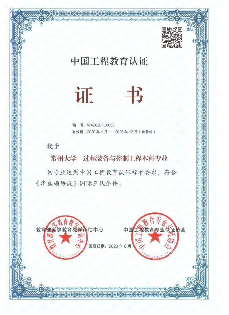 过程装备与控制工程专业2018年申请,2019年完成现场考查,2020年发文通过第二轮认证。