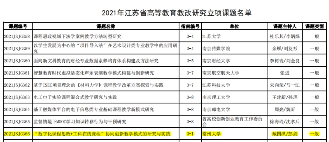 2、2021年获得江苏省高等教育教改研究课题立项1项。