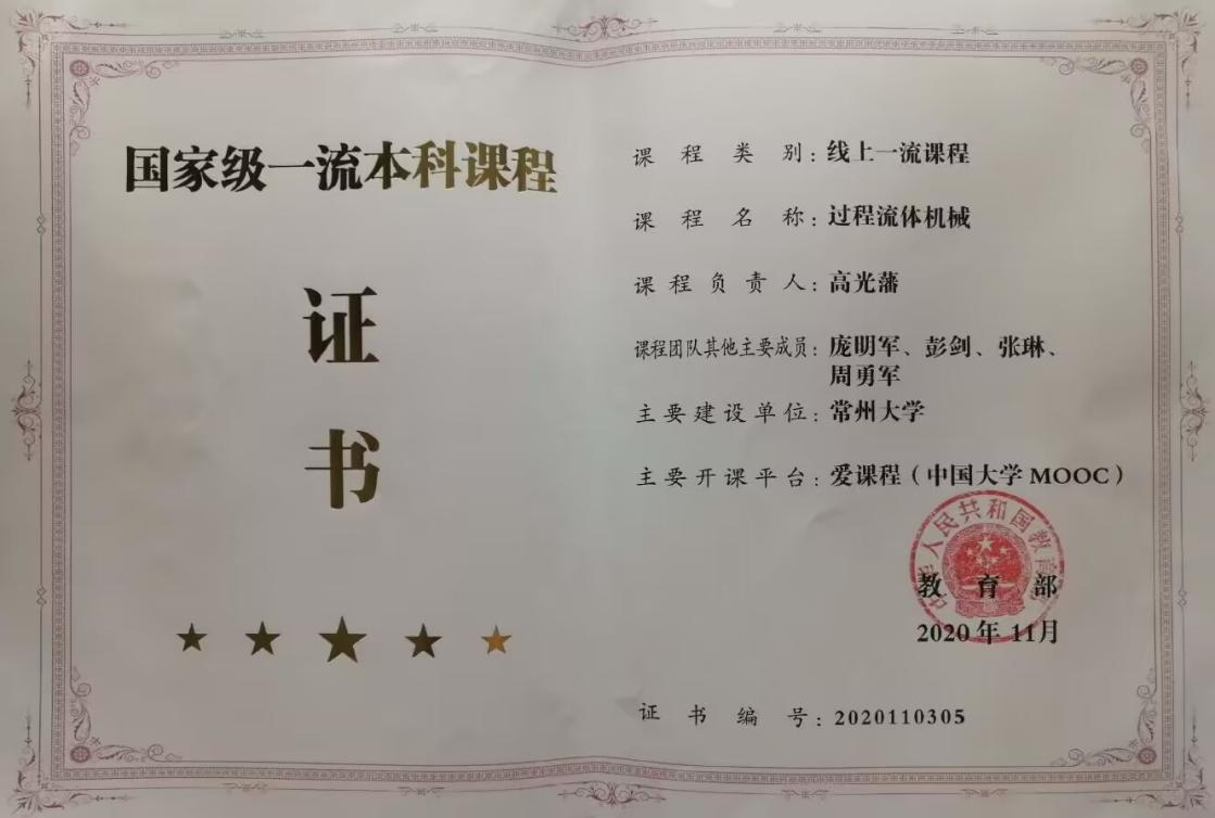 1、《过程流体机械》2018年成为常州大学第一批在线开放课程认定的7门课程之一,2020年成为首批国家级一流本科课程,2021年获批本科教育省级课程思政建设示范课程(苏教办高函〔2021〕11号)。