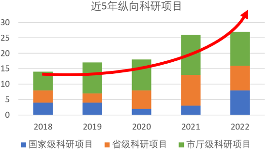 实施科研项目专项提升计划,纵向科研项目稳步提升:近五年,新增了纵向科研项目102项,其中国家级项目21项、省部级项目31项、市厅级项目50项,在国家级项目、重大横向等实效性科研工作方面取得稳步提升,助力学校科研高质量发展。