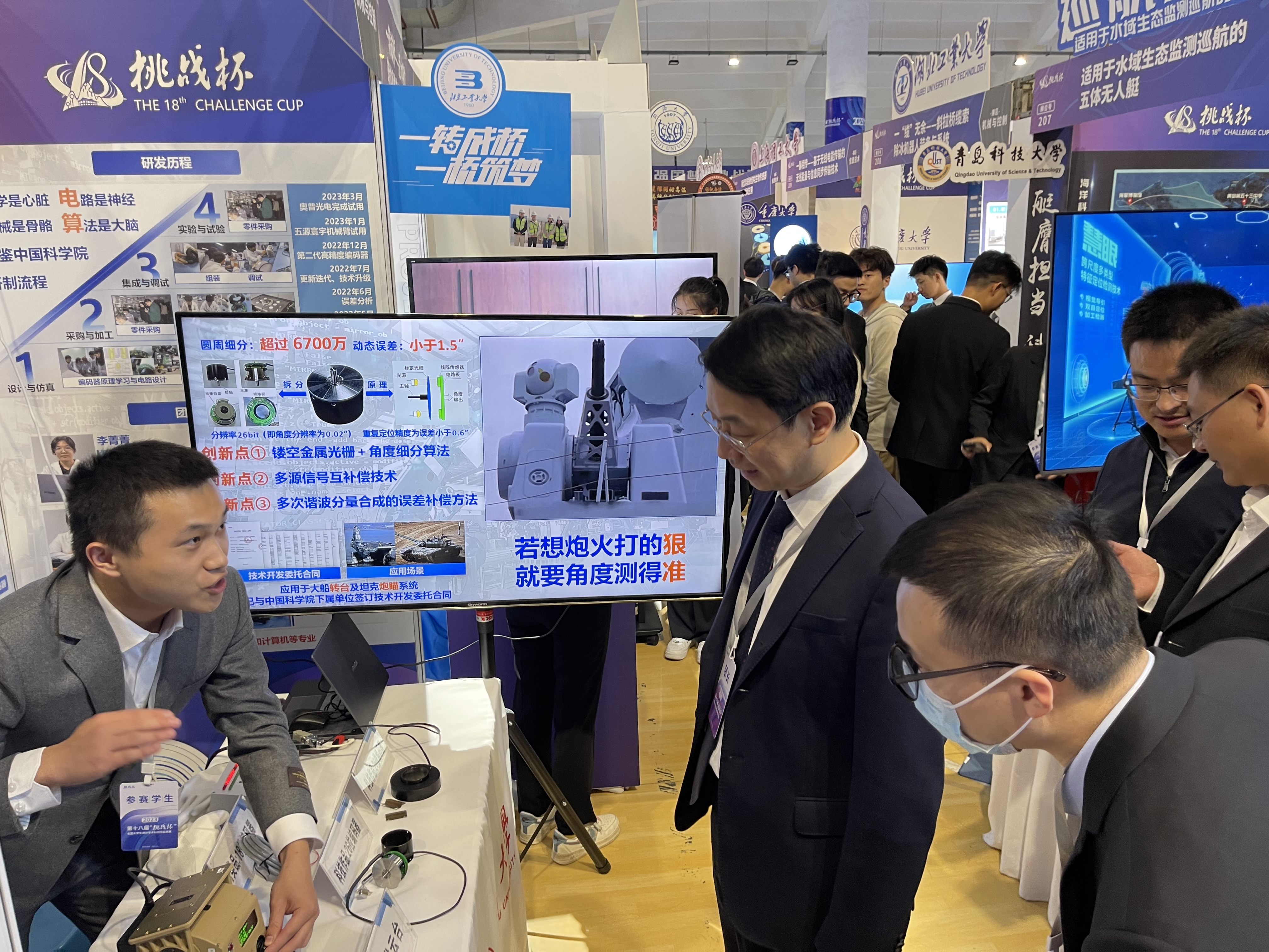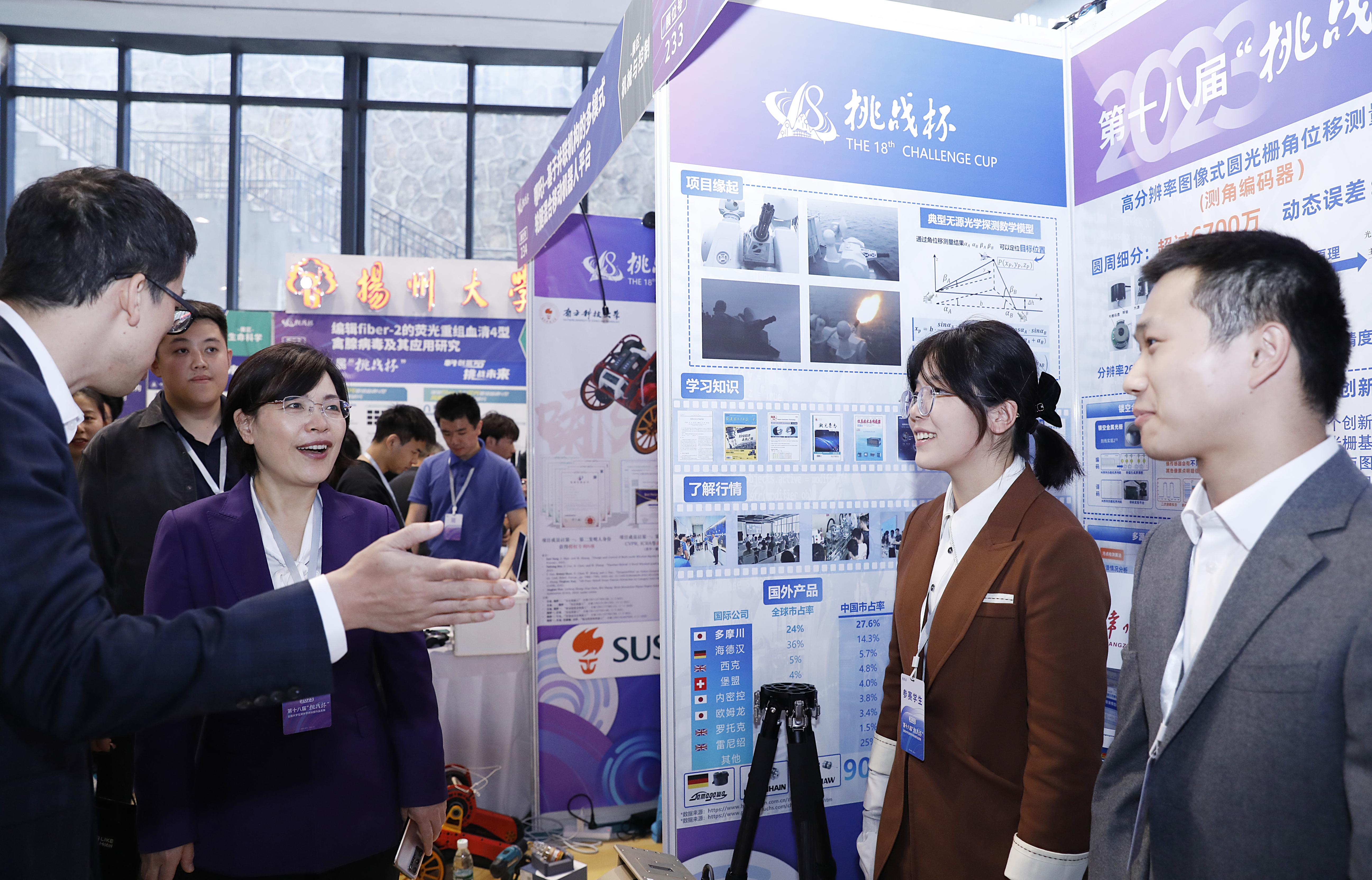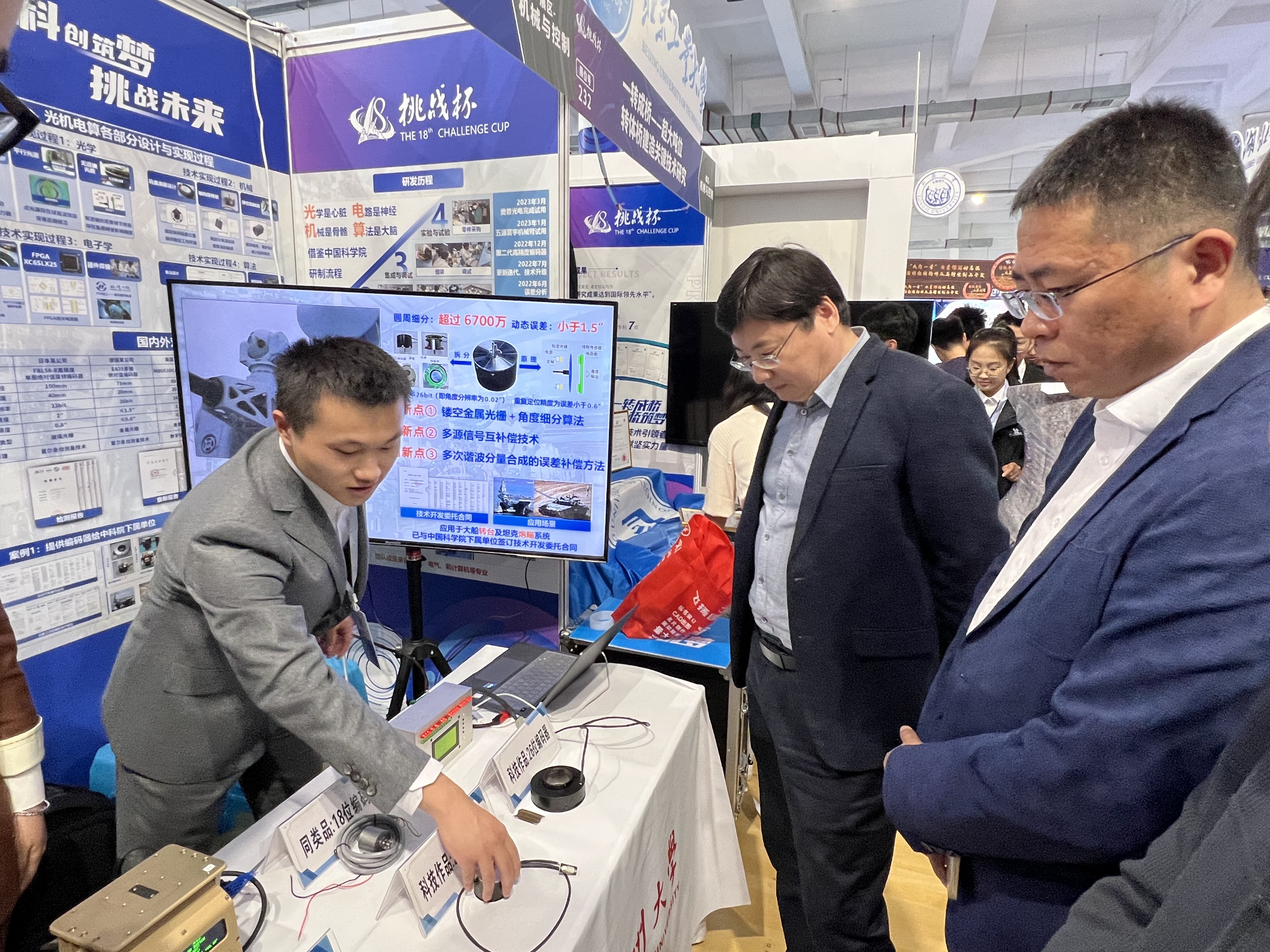 该项目成员分工协作,优势互补,通过不断的实践与积累,利用镂空金属光栅、多源信号互补偿技术、加入误差补偿函数等方法研制出一款高分辨率图像式圆光栅角位移测量装置,提升了编码器的测角精度,分辨率和鲁棒性,为军工装备提供旋转位置信息。队员们在比赛中配合默契,表现优异,充分展现了我院学子昂扬的精神面貌。本次大赛设立科技成果作品展,共青团江苏省委副书记熊俊、校党委副书记黄海燕莅临我院展位关心指导,认真听取项目介绍,并对科技创新成果予以充分肯定。