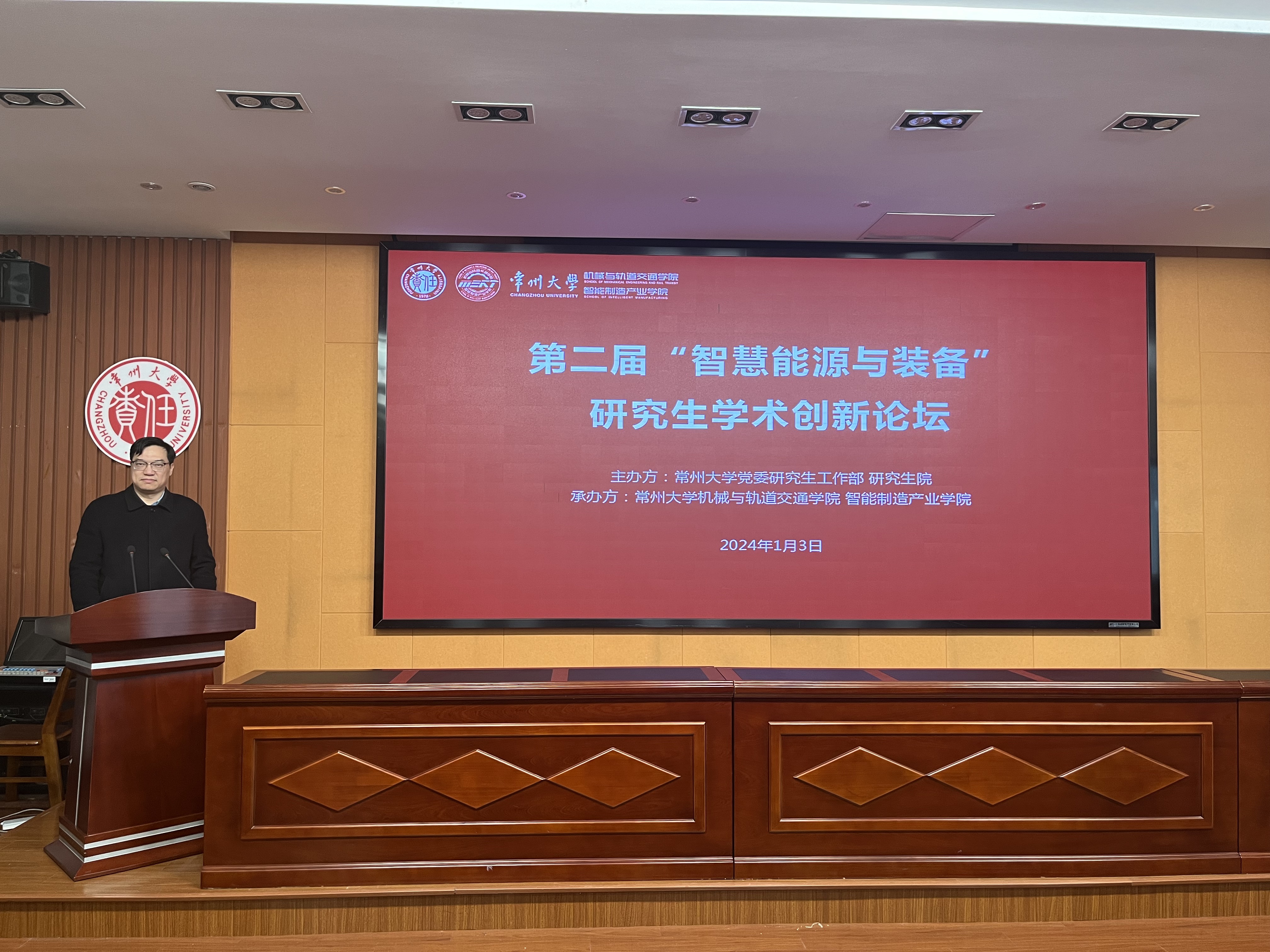 1月4日下午,由常州大学党委研究生工作部 研究生院主办,机械与轨道交通学院 智能制造产业学院承办的常州大学第二届“智慧能源与装备”研究生学术创新论坛于乐行楼243报告厅成功举办。机械与轨道交通学院 智能制造产业学院副院长付双成、副院长郑剑锋出席论坛,评委老师、参赛学生以及各年级研究生代表等150余人参加论坛。